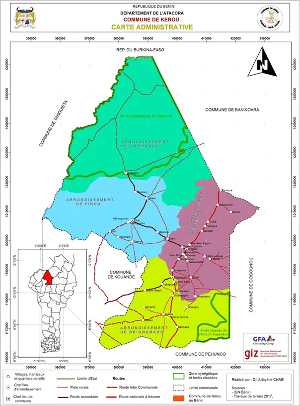 Comprise entre 10° 15’ et 11°09’ de latitude Nord et 1°43’ et 2°17’ de longitude Est, la Commune couvre une superficie totale de 3745Km² et compte quatre (04) arrondissements que sont : Kérou, Brignamaro, Kaobagou et Firou ; quarante-trois (43) villages administratifs et quartiers de ville. La Commune reçoit du côté ouest, une portion de la partie terminale de la chaîne de l’Atacora. La grande partie de la Commune est située dans une pénéplaine qui s’étire dans la ligne de partage des eaux entre les bassins du Niger au Nord et celui de l’Atlantique au Sud.