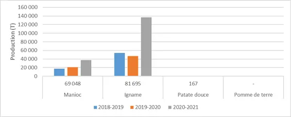 Parmi les tubercules et racines produites dans la commune, nous avons en premier l’igname suivi du manioc. La patate douce et la pomme de terre sont négligeables en terme de production. Quant au manioc, bien que très peu produit, on constate que la superficie d’emblavure et la production ont connu une légère croissance au cours de ces quatre dernières années. Par contre au niveau de l’igname on note une variation de ces deux facteurs au cours de ces années, avec une augmentation de sa production pour la campagne de 2020-2021.
