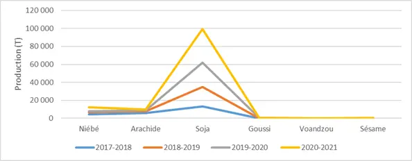 Le soja représente la légumineuse la plus emblavée de toutes les légumineuses cultivées au cours de ces campagnes agricoles. Sa production connaît une nette croissance à partir de de la campagne de 2019- 2020. Dans le même temps, les autres légumineuses ont connu une nette régression voire un abandon de production.