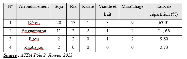 L’analyse du tableau montre que sur les cinq (05) filières existantes dans la commune, la filière soja est la plus représentée. Elle est suivie par celle du riz et le maraîchage. Les filières viande-lait et karité sont très faiblement représentées. En ce qui concerne les OPA, elles sont inégalement réparties dans l’ensemble de la commune. Elles sont très concentrées dans l’arrondissement de Kérou, 63,01% avec la présence de toutes les filières. A Brignamaro, nous avons 24,66% des OPA avec aussi la présence de toutes les filières et la filière viande et lait est la plus représentée. A Firou, nous avons 9, 60% des OPA et on note l’absence de la filière karité à Firou et 2, 73% à Kaobagou. Particulièrement dans l’arrondissement de Kaobagou, toutes les filières sont absentes sauf la filière soja.